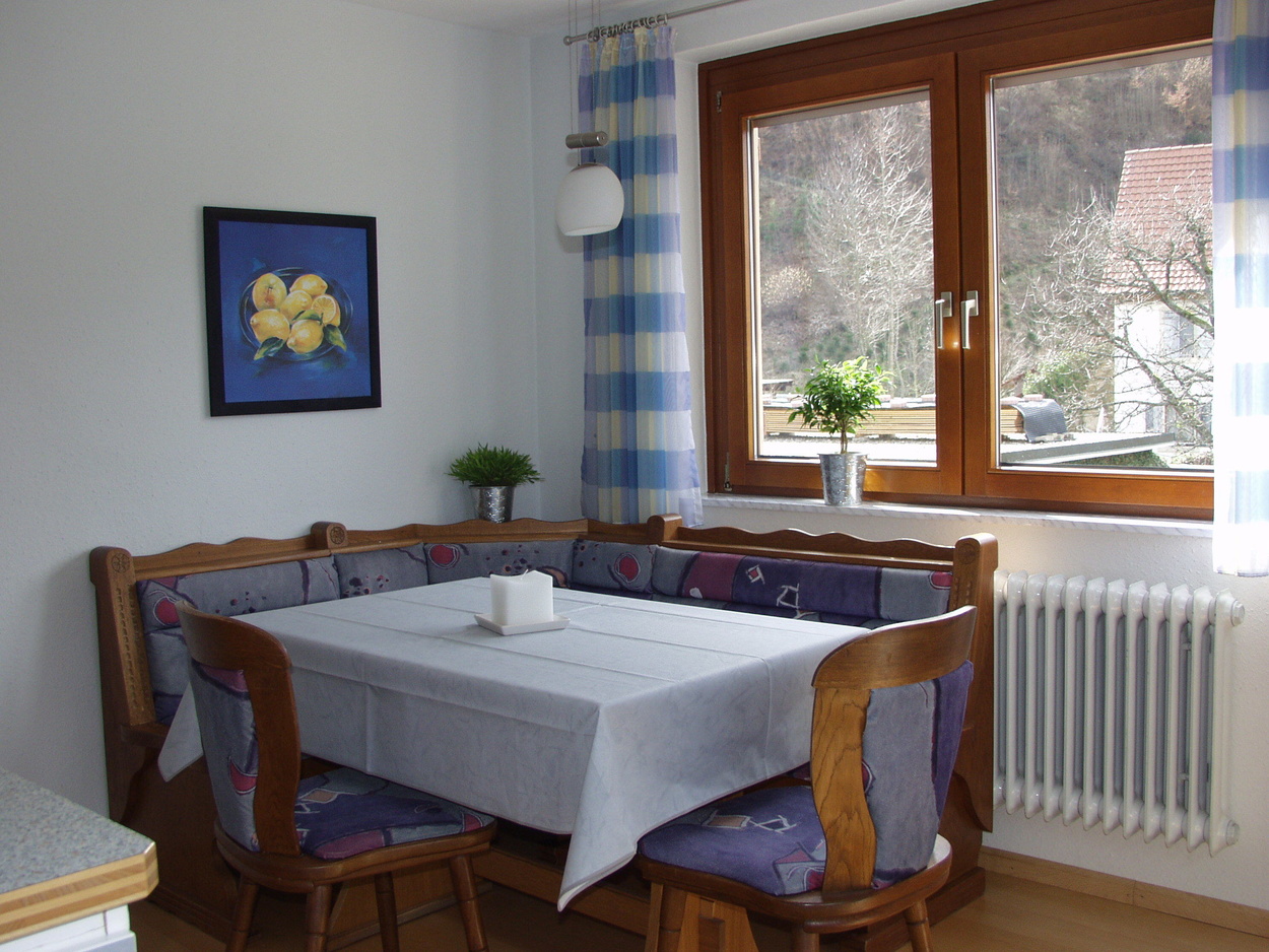 In der modernen Wohnküche finden Sie alles, was zu einer gehobenen Ausstattung gehört: 4-Plattenherd mit Backofen, Dunstabzug, Spülmaschine, Kühlschrank, Wasserkocher und Kaffeemaschine. Vom hellen, geräumigen Schlafzimmer aus haben Sie Blick in den Garten. Das Bad ist mit Dusche, WC und Waschmaschine ausgestattet. Im Wohnzimmer befindet sich eine Sitzgruppe mit Tisch, Sat-TV und Stereoanlage. Die eine Couch ist ausklappbar und ergibt eine zusätzliche Schlafmöglichkeit für 2 Personen (Liegefläche von 1,40 x 2,00 m). Vom Wohnzimmer aus geht es auf die Terrasse, dem "Goldstück" dieser Ferienwohnung. Die gemütlichen Holz-Sitz-Möbel laden zum Entspannen und Essen im Freien ein. Hier können Sie ausruhen und die Aussicht auf die umliegenden Schwarzwaldberge genießen.Bilder: Unsere Ferienwohnung Goldbergblick